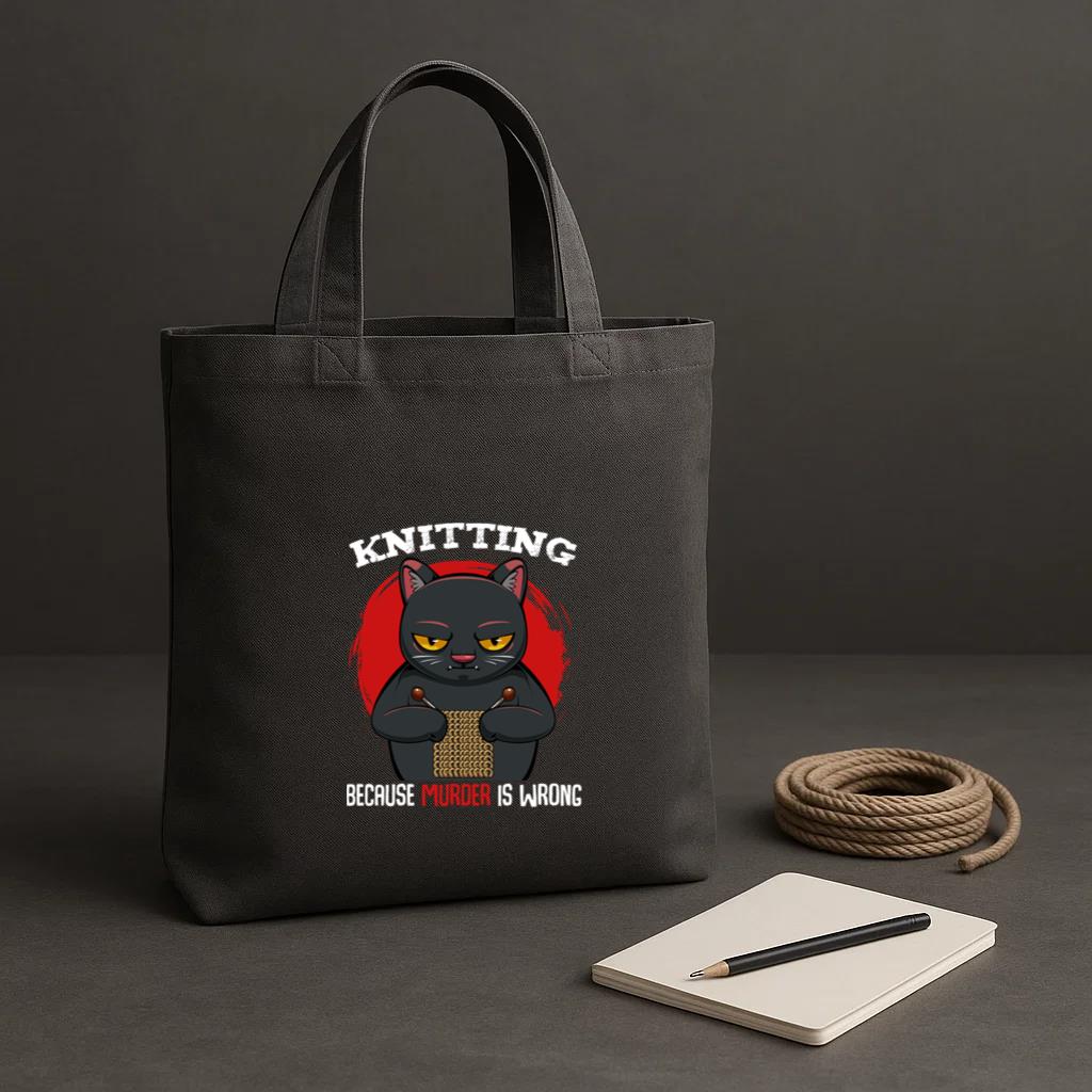 Chic, durable, and reusable, this Knitting Because Murder Is Wrong Black Cat Tote Canvas Bag canvas tote bag is your daily go-to or a thoughtful gift for any occasion.